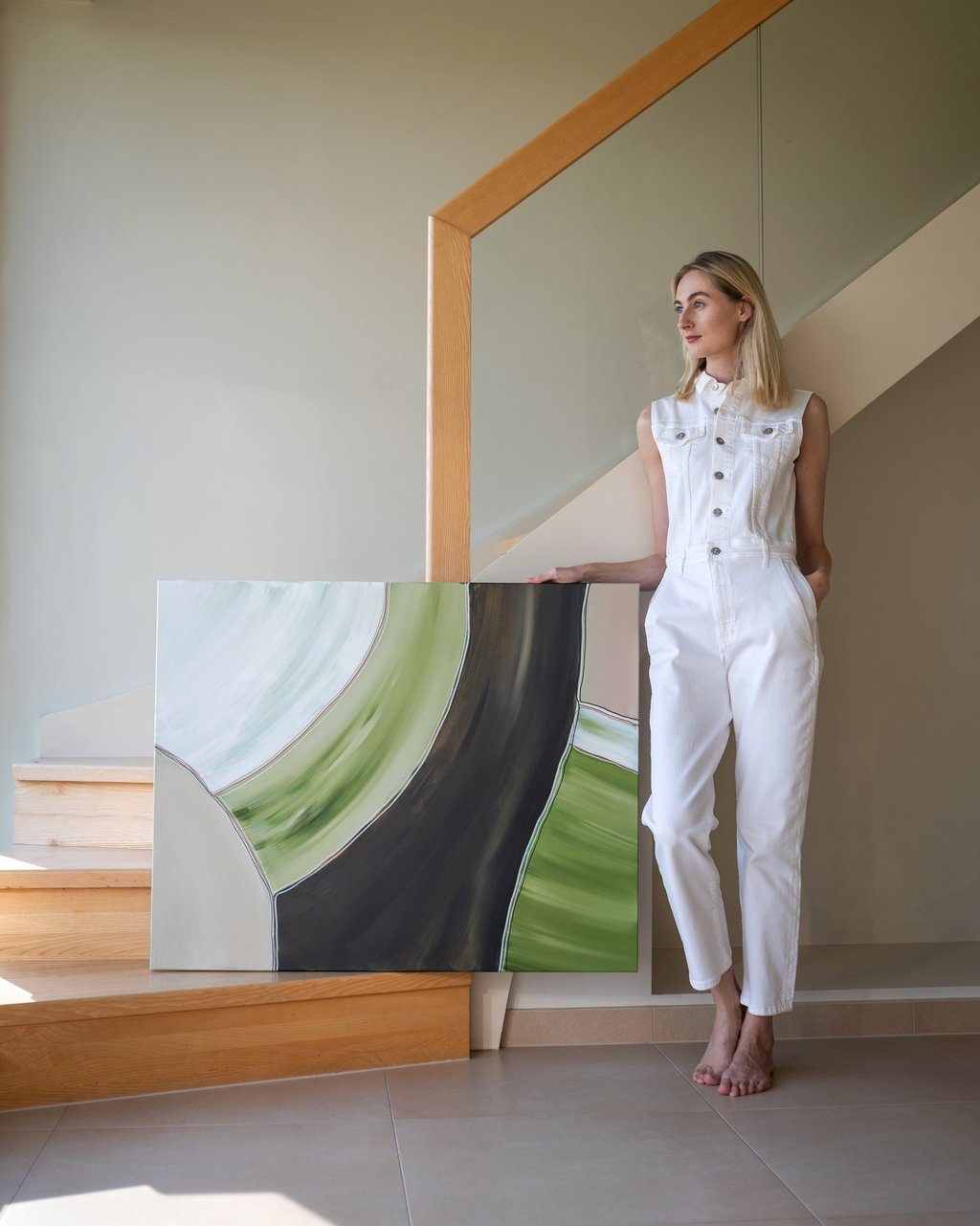 The choice of colors and lines in this painting invites the viewer to interpret and connect with the artwork on a personal level