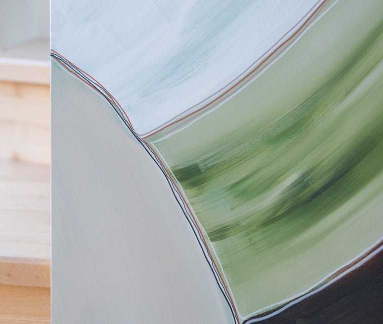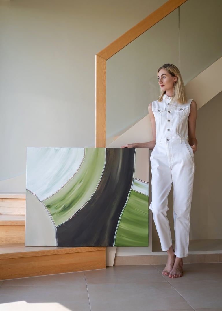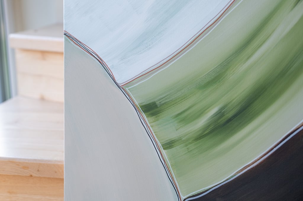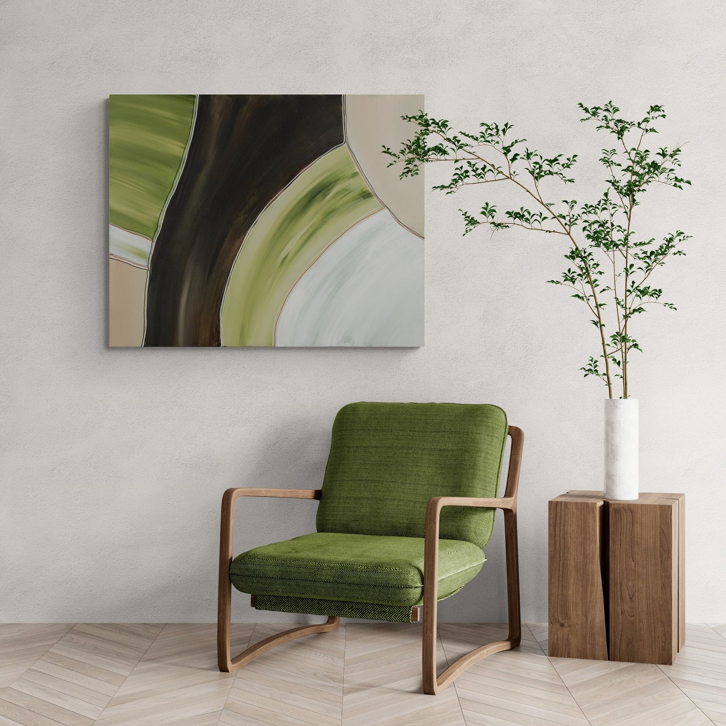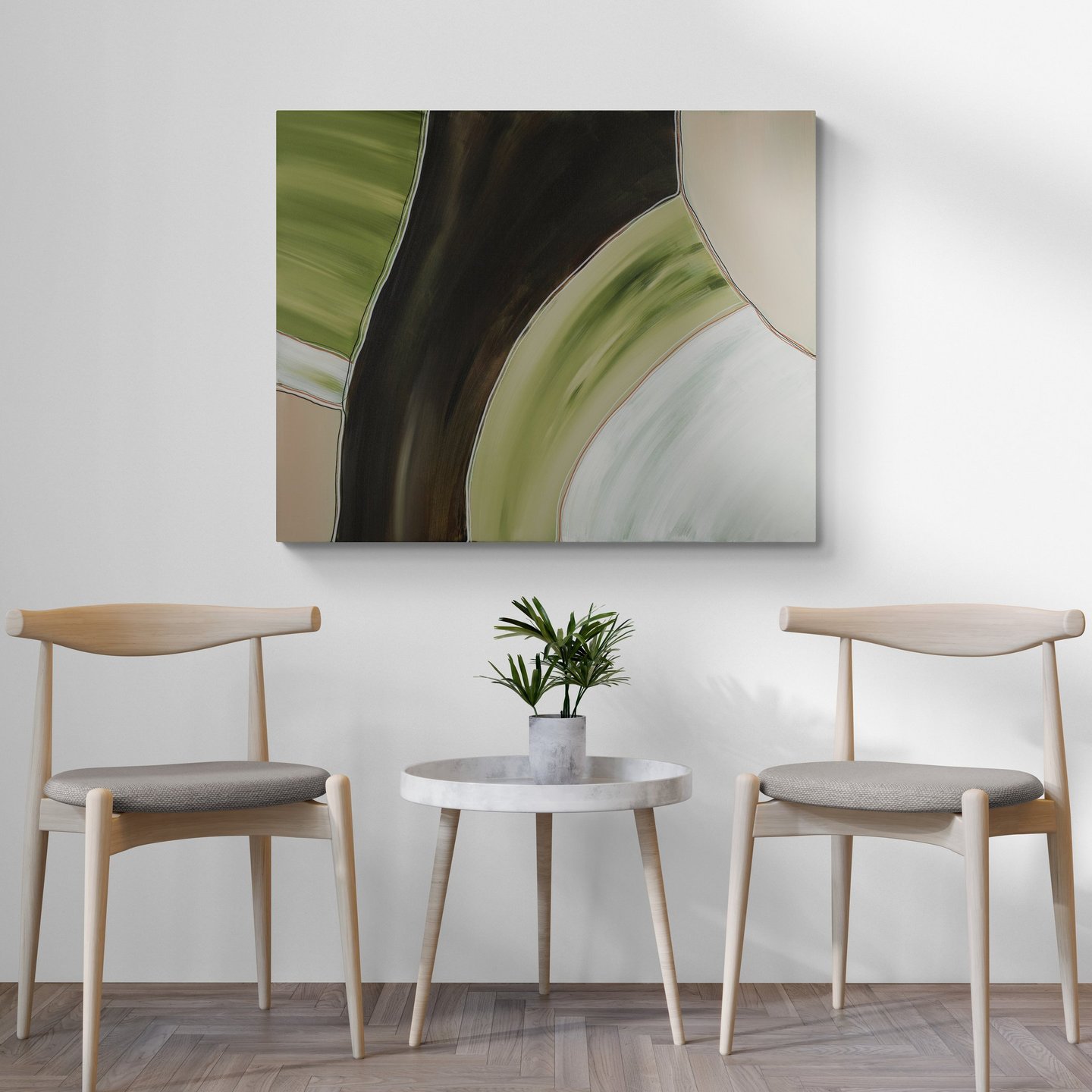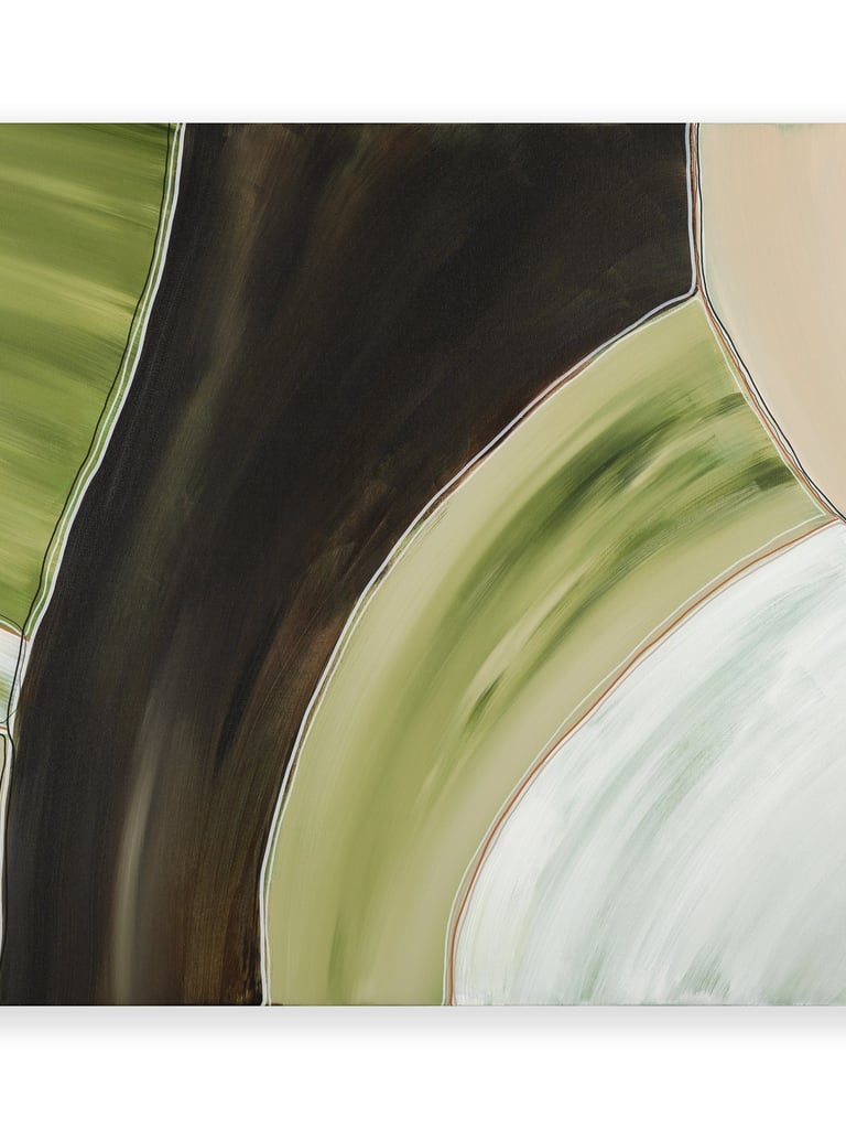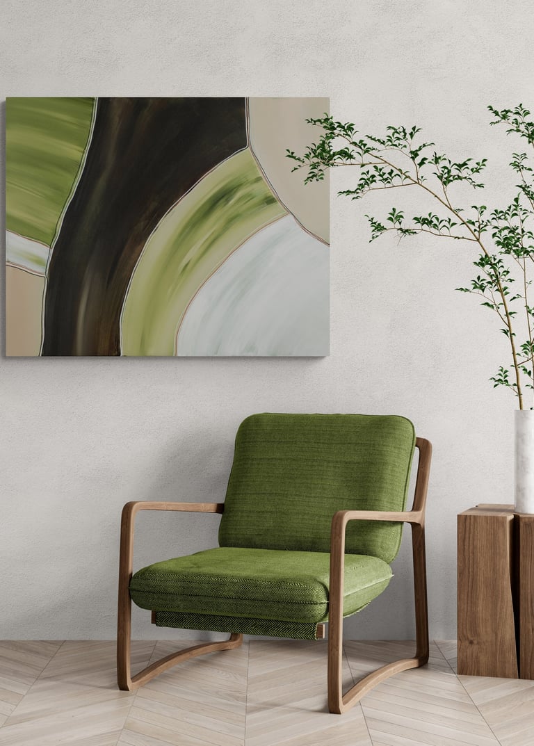 No.102 abstract painting showcases a combination of green, brown, and white shades, creating a sense of tranquility and harmony.