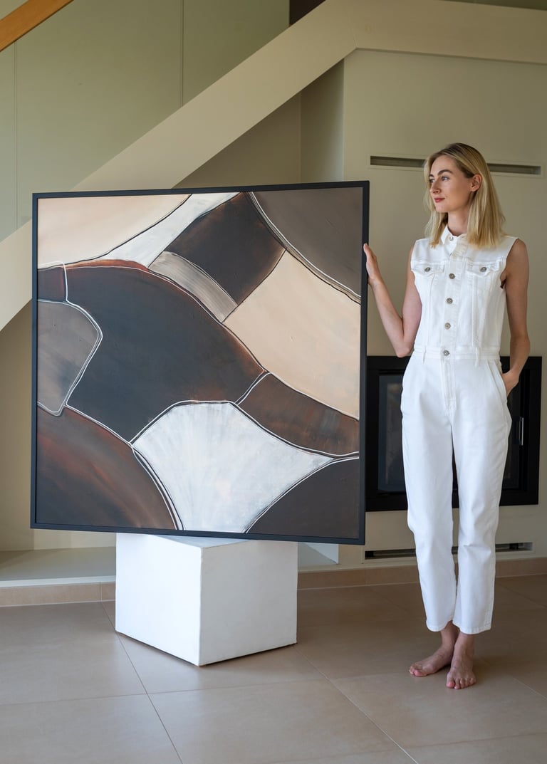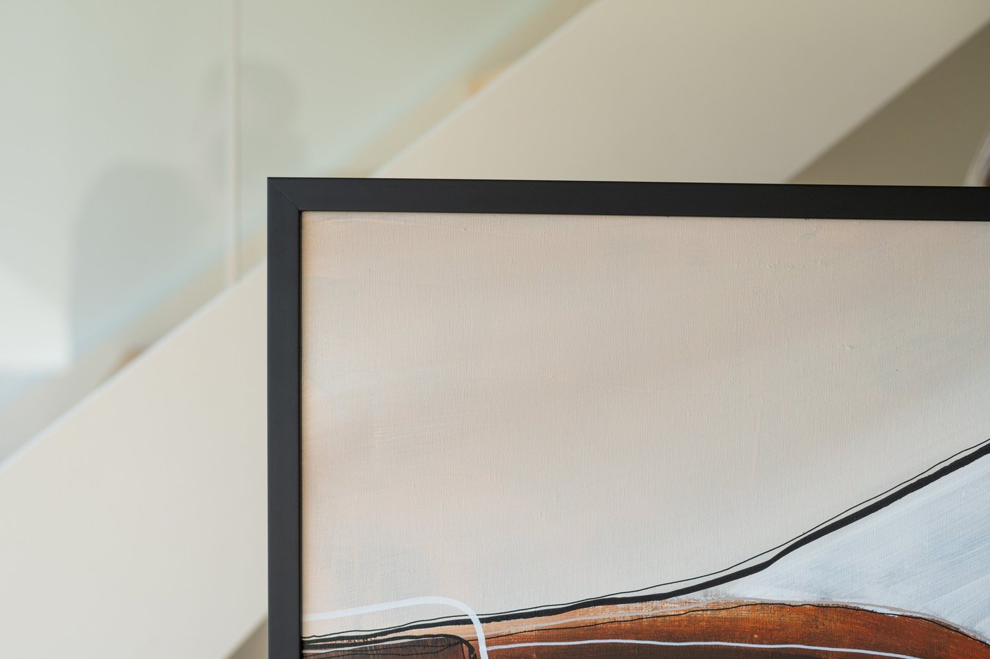 The overall composition is bright and dynamic, capturing the viewer's attention. The painting is complemented by a minimalist black frame, which enhances its contemporary appeal.