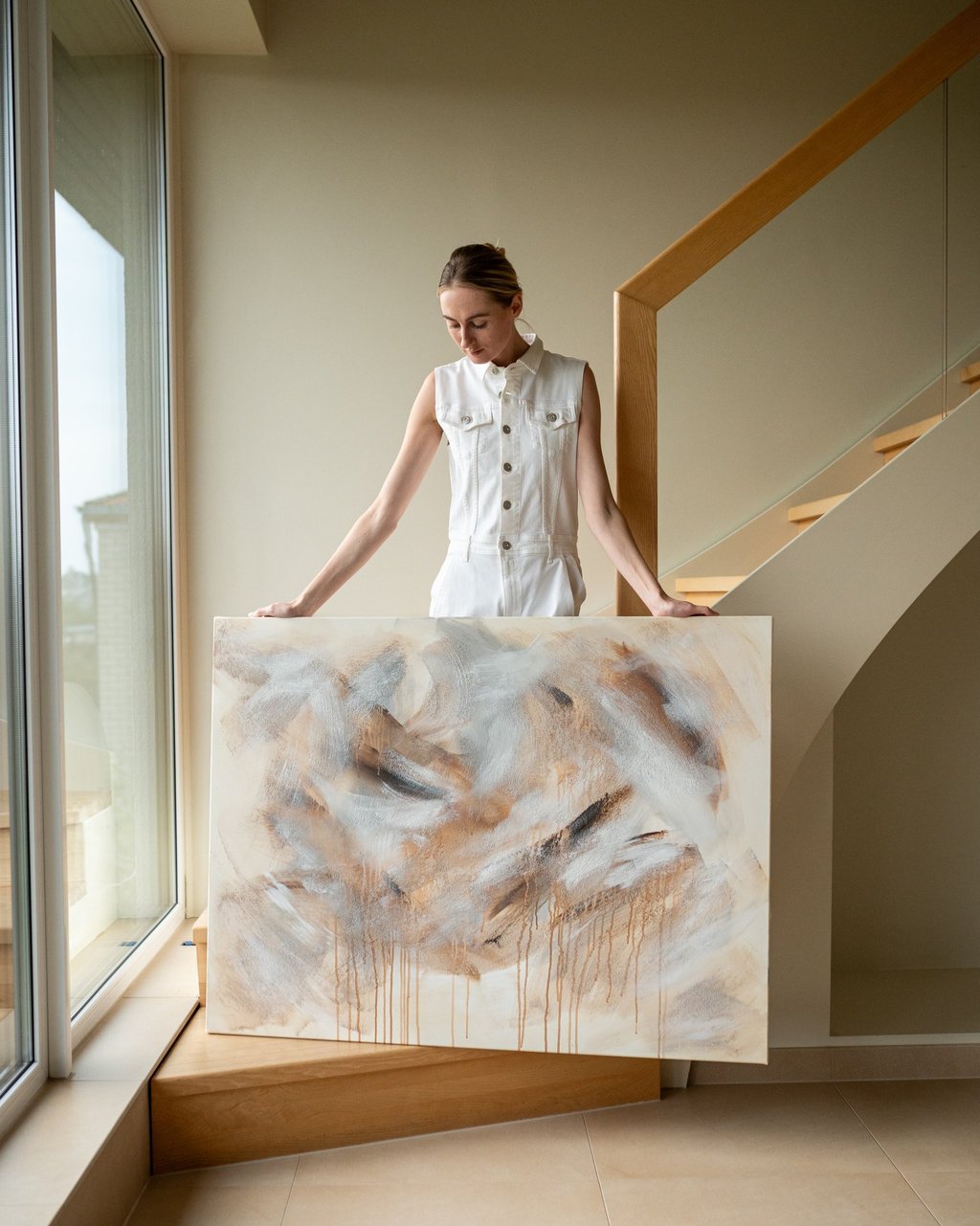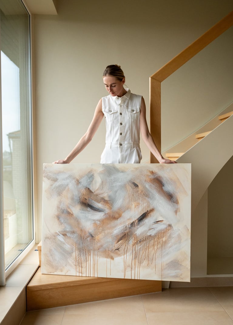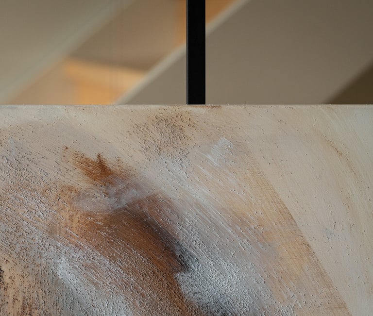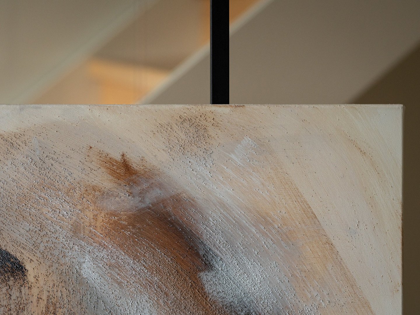 No.110 abstract painting showcases a harmonious blend of warm brown and sand tones, alongside hints of beige, white and grey. The use of sand texture adds depth and dimension to the artwork, creating an engaging visual experience.