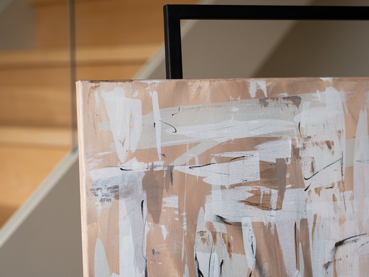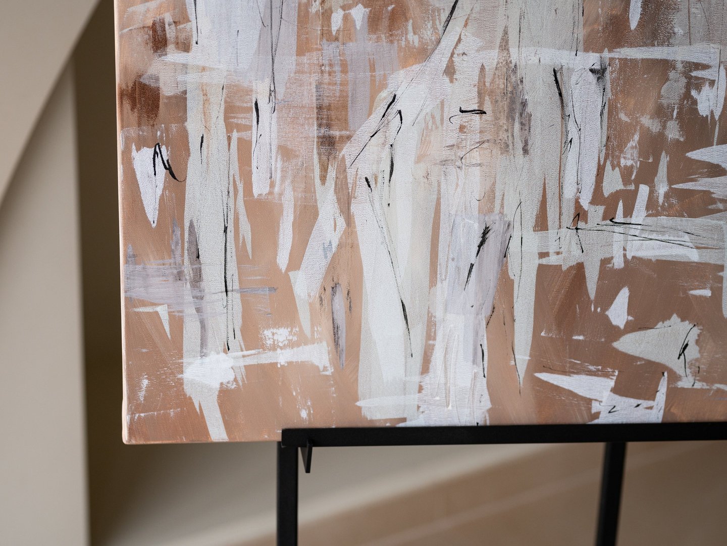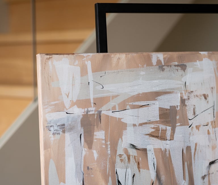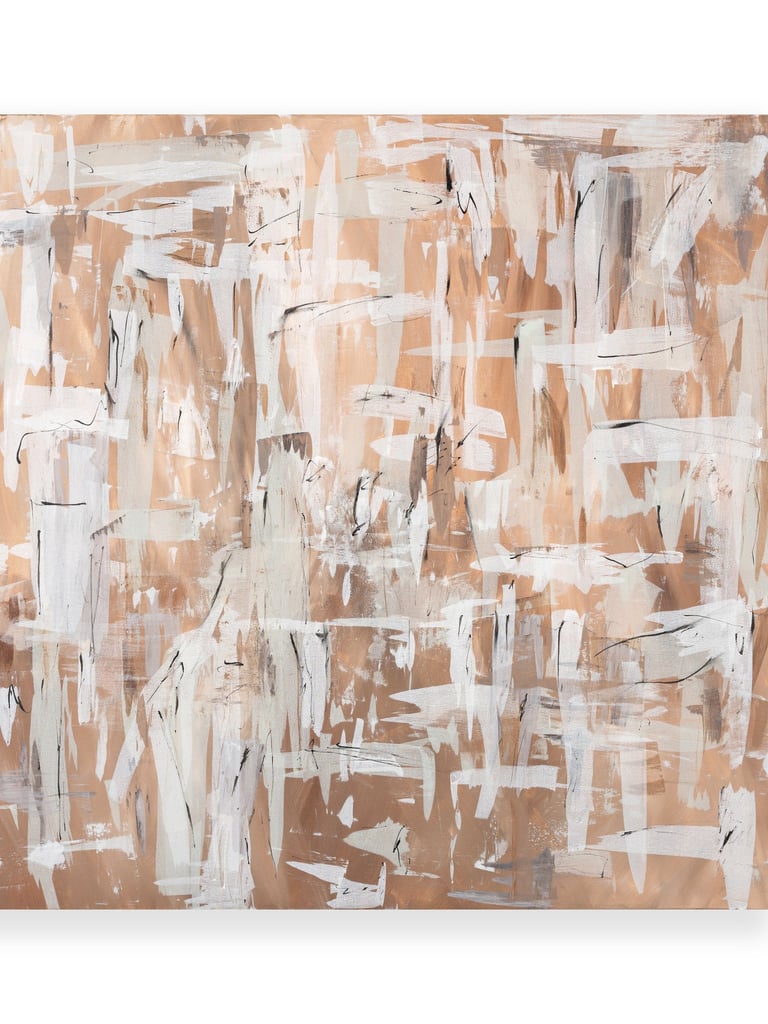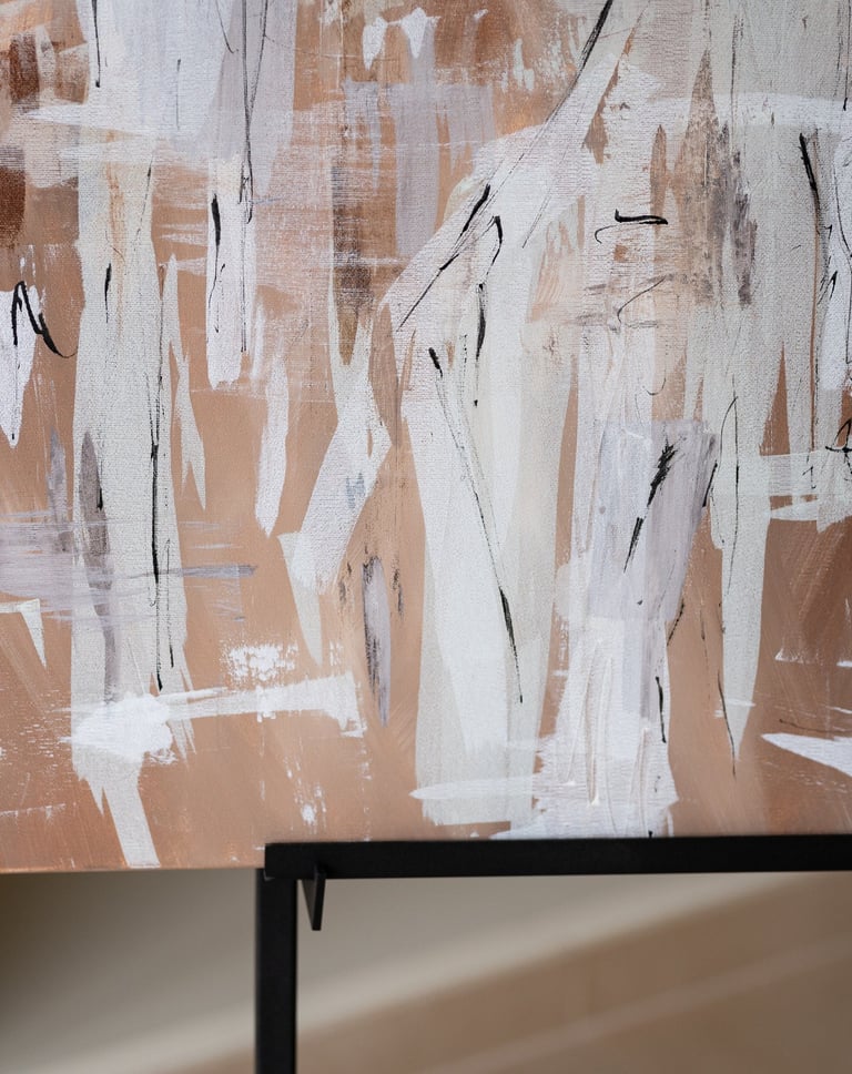 The combination of these colors creates a harmonious and soothing atmosphere, evoking feelings of tranquility and warmth. The warm brown and sand tones provide a grounding effect, while the white brush strokes add a sense of movement and energy to the composition.