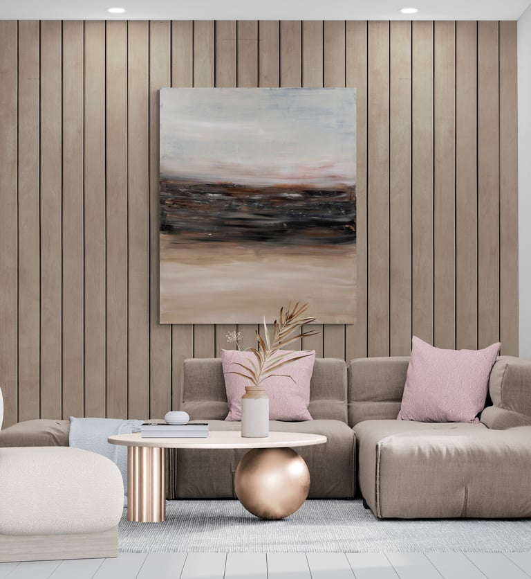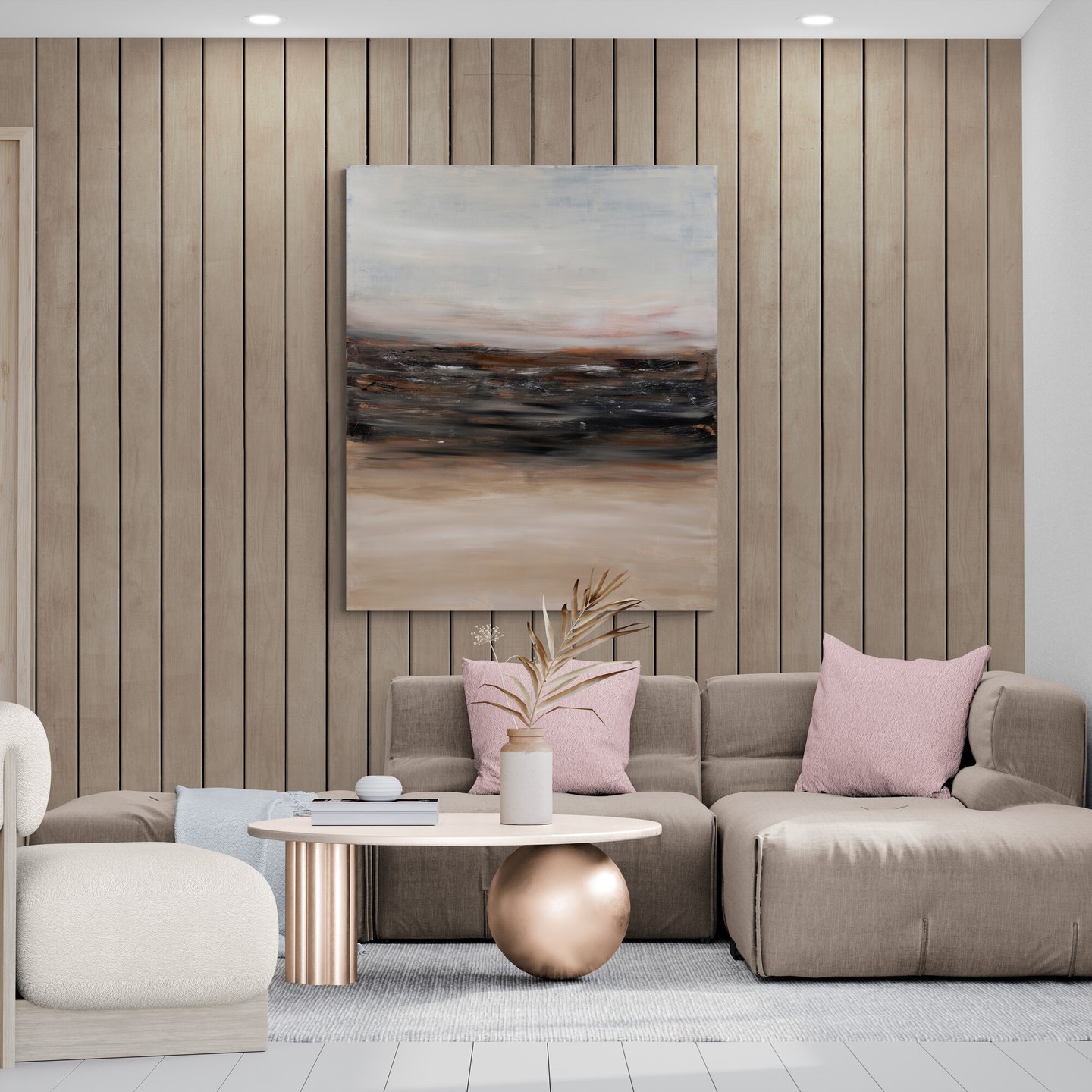 No.114 abstract painting is a serene and tranquil piece, with warm brown and sand tones dominating the canvas. The artist has incorporated hints of blue tones, adding depth and contrast to the overall composition.