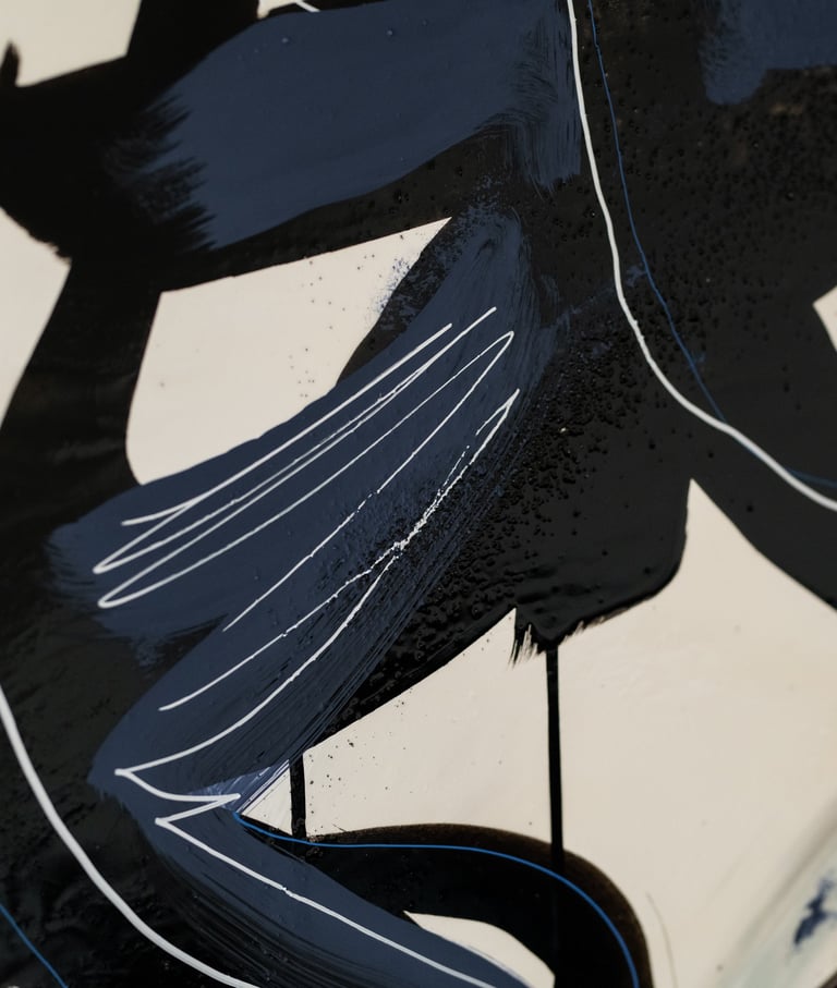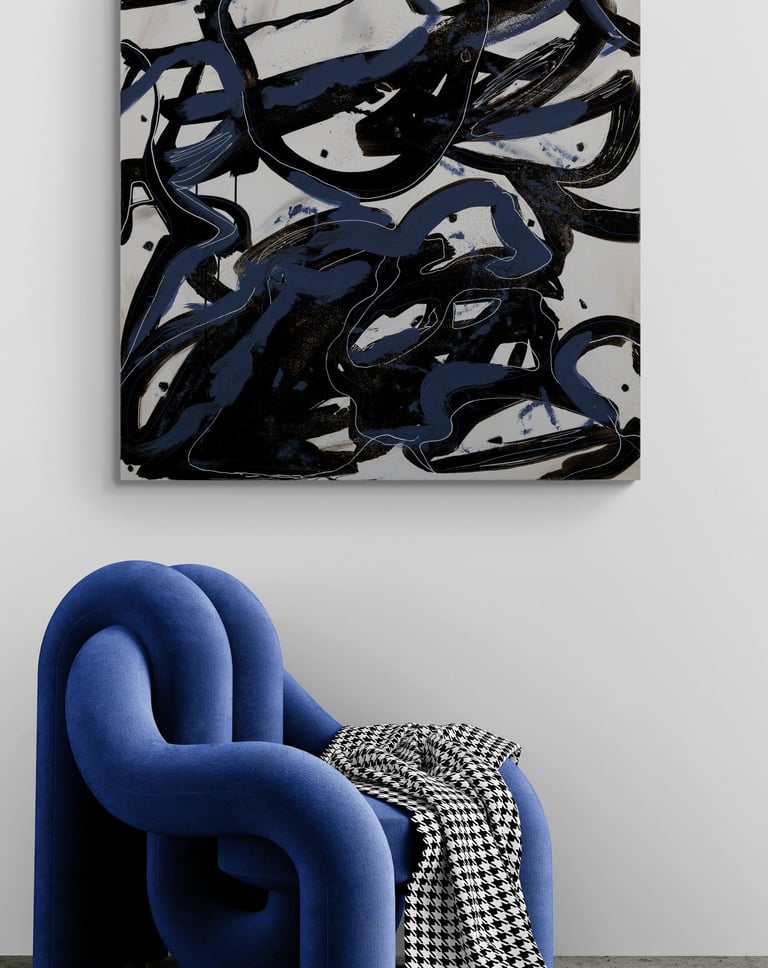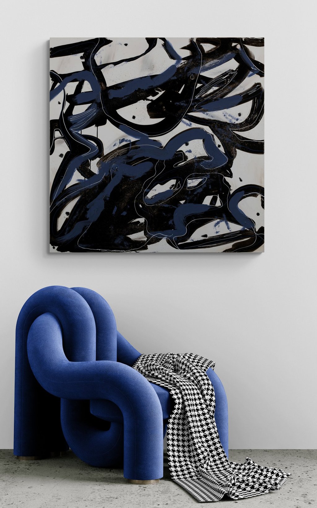 No.119 abstract painting features a striking combination of black and blue colors, creating a visually captivating contrast. The black color dominates the canvas, while the blue color accents certain areas, adding depth and intrigue to the composition.