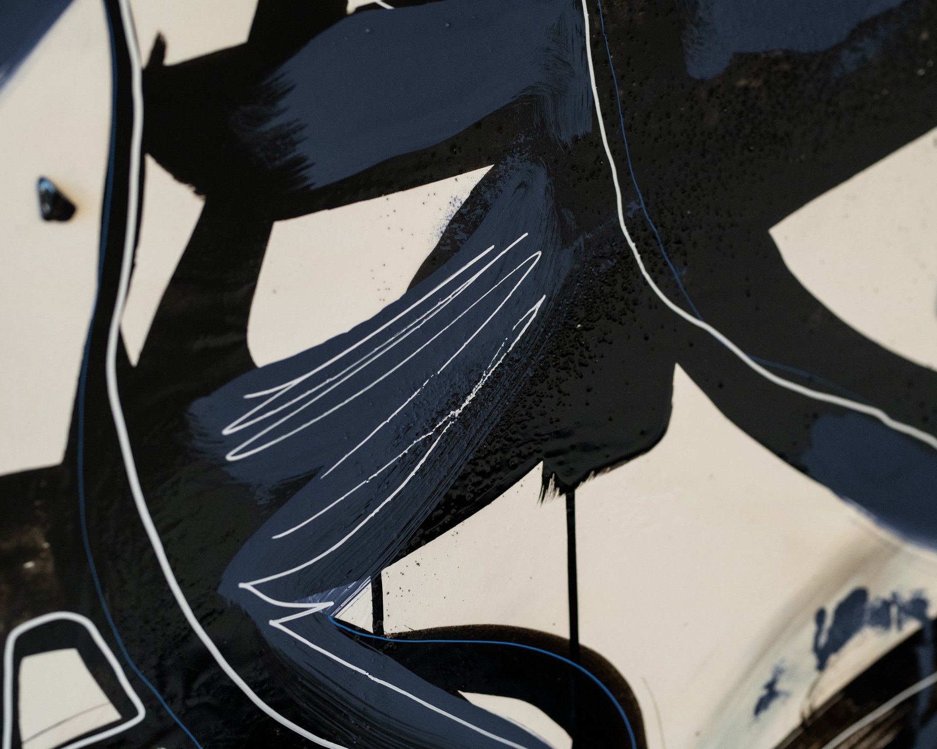 The painting also showcases a sand texture and glossy surface, giving it a tactile quality that adds an interesting dimension to the artwork. The texture is accompanied by a series of lines, which bring a sense of movement and dynamism to the piece.