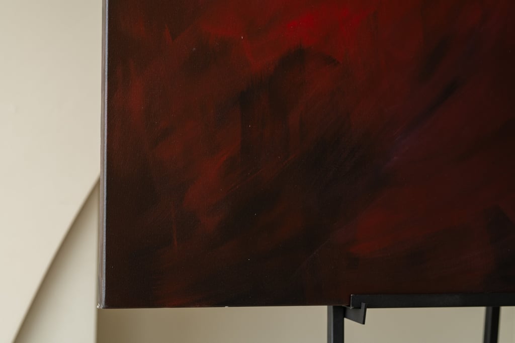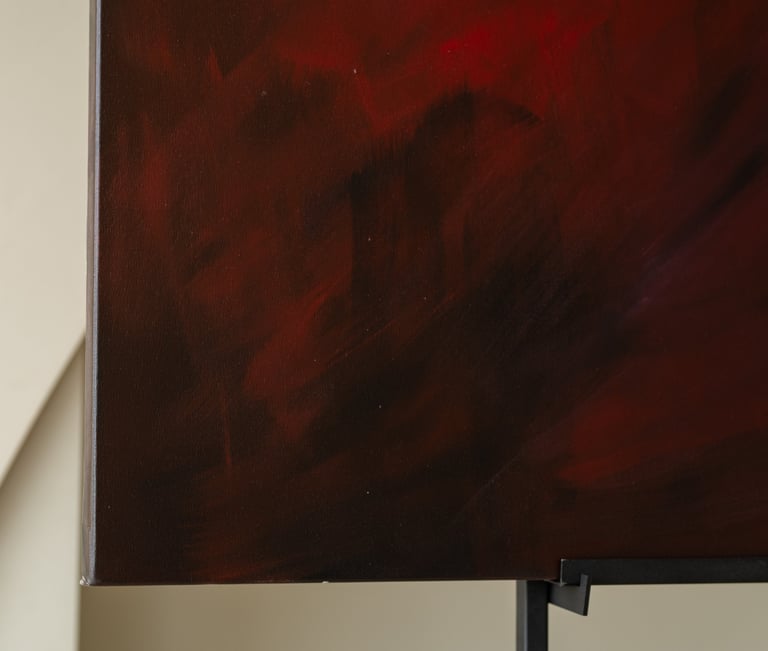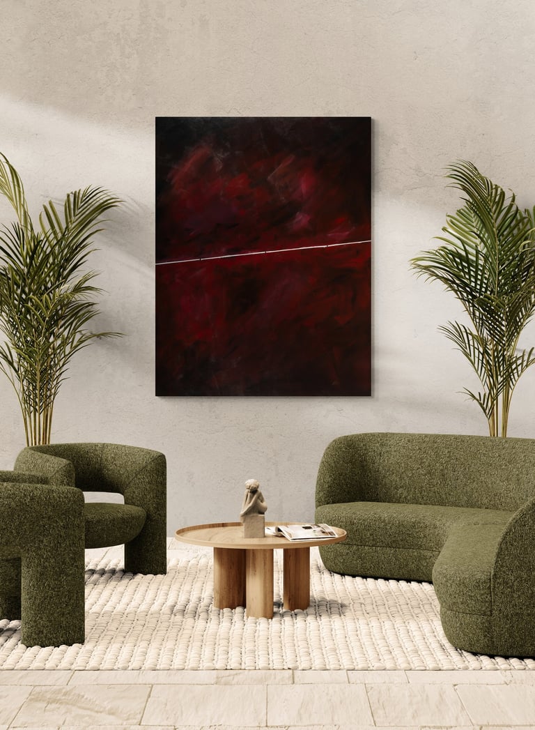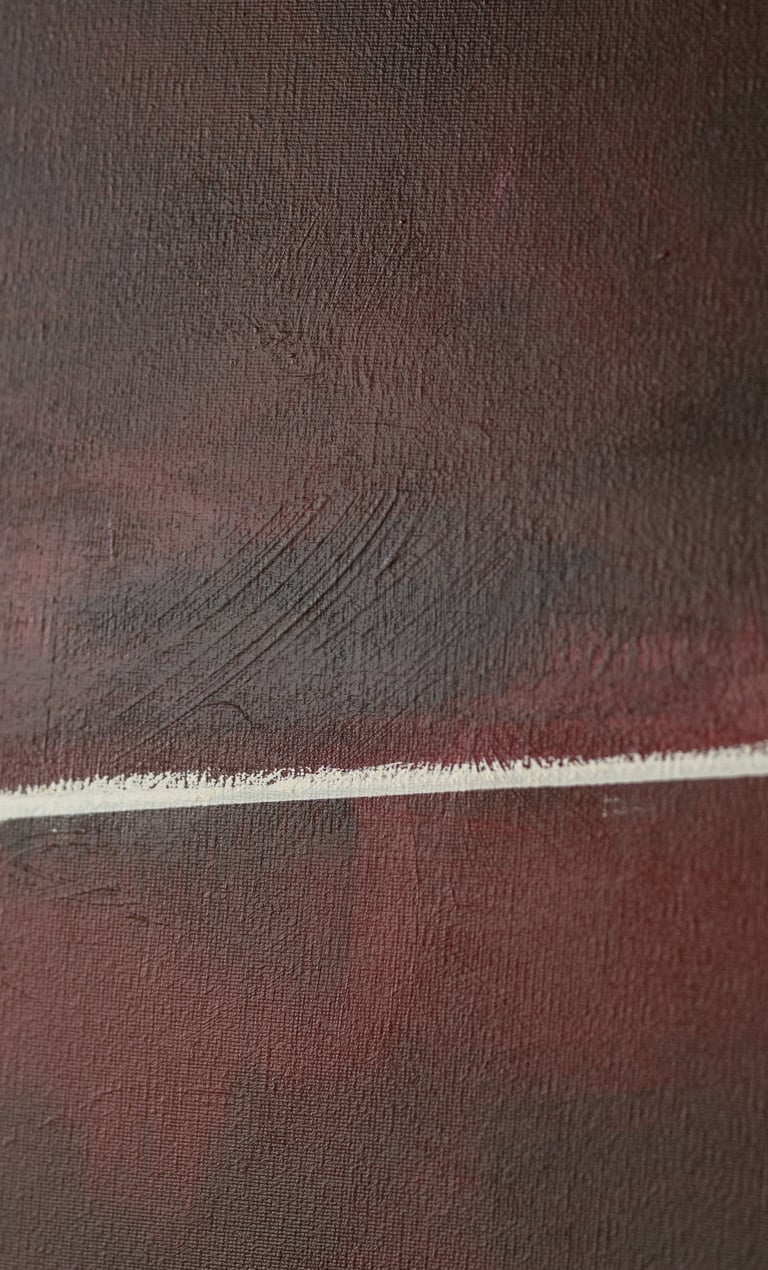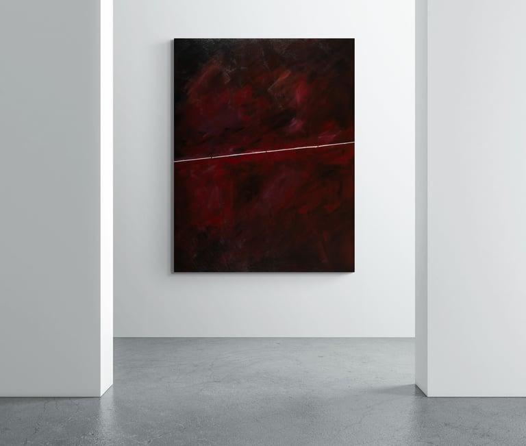 This symbolize the journey of life and the different phases and moments that we experience along the way. The deep red hues convey a sense of passion, intensity, and emotion, while the singular white line represents a path or direction within this complex journey. This painting serves as a reminder to embrace the various phases and moments of life, and to find beauty and meaning in each step of the journey.
