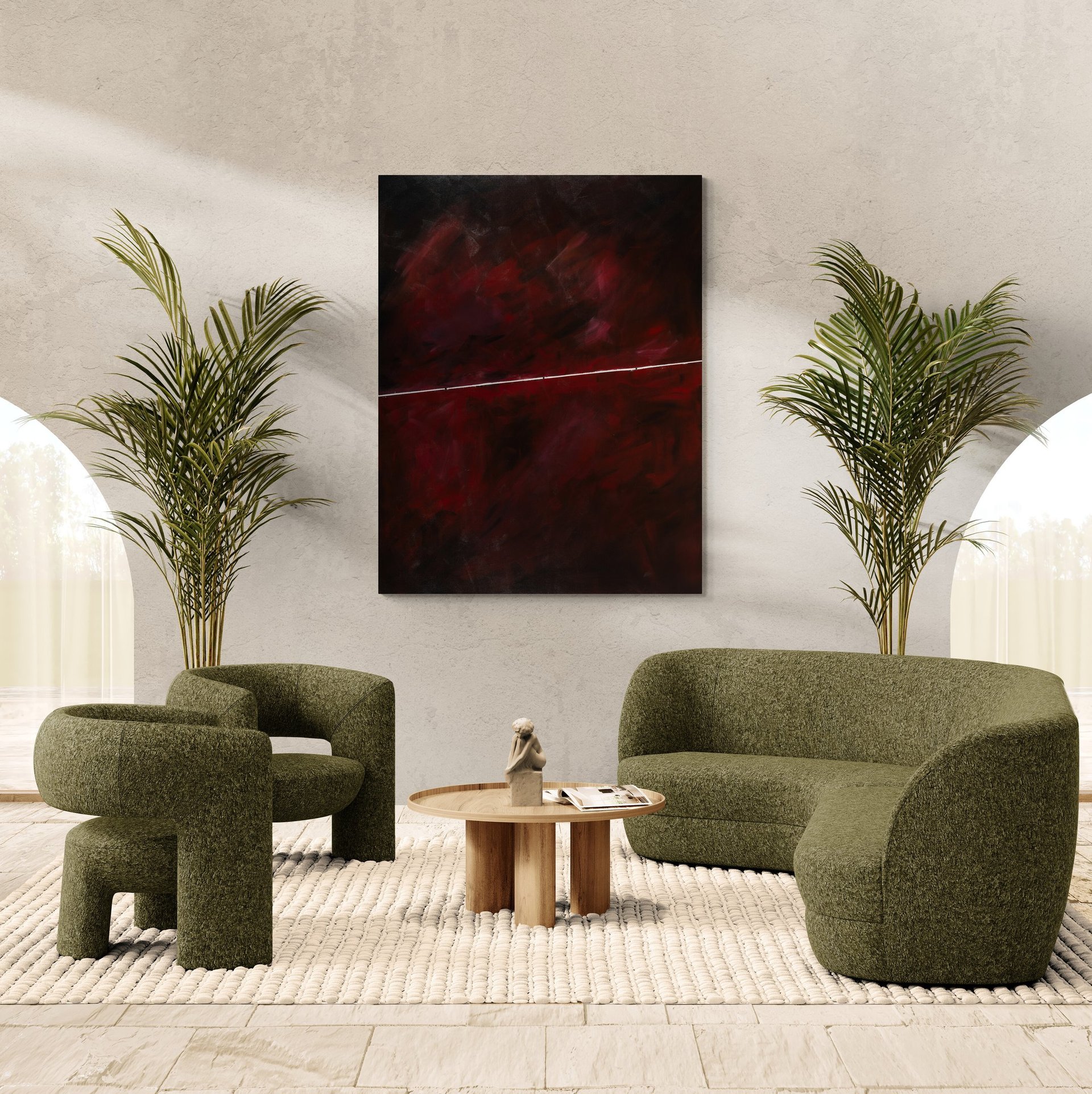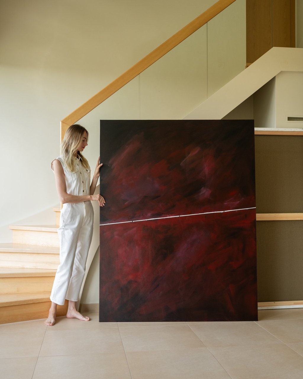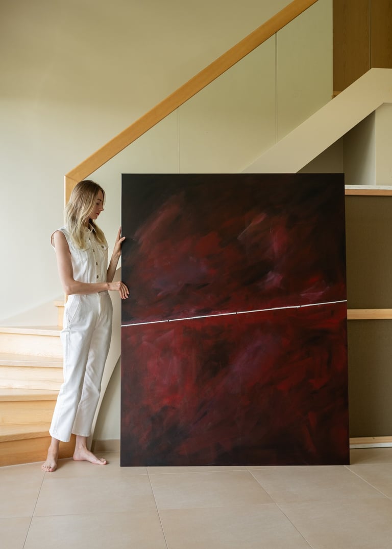 This symbolize the journey of life and the different phases and moments that we experience along the way. The deep red hues convey a sense of passion, intensity, and emotion, while the singular white line represents a path or direction within this complex journey. This painting serves as a reminder to embrace the various phases and moments of life, and to find beauty and meaning in each step of the journey.