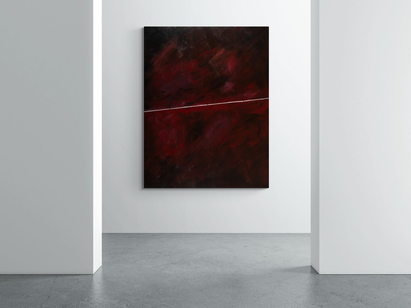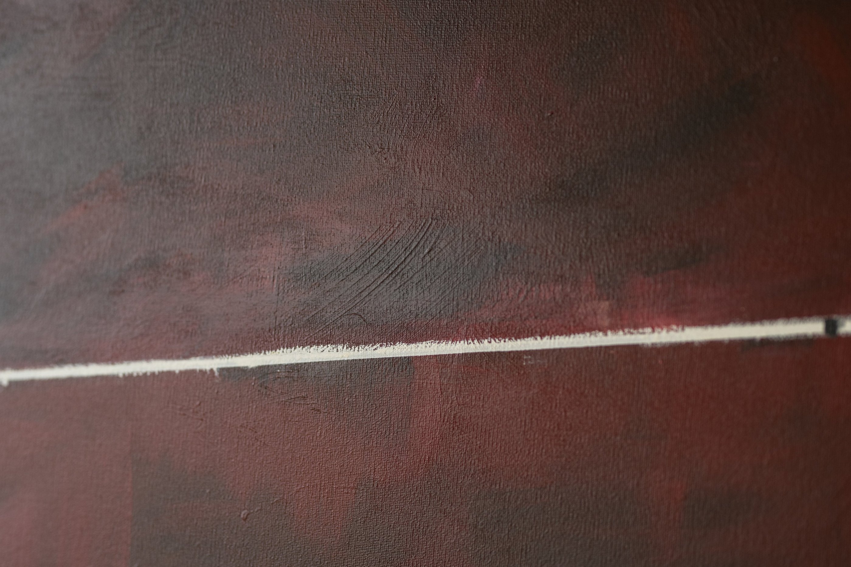 No.121 abstract painting features dark red shades with accent of a single white line.