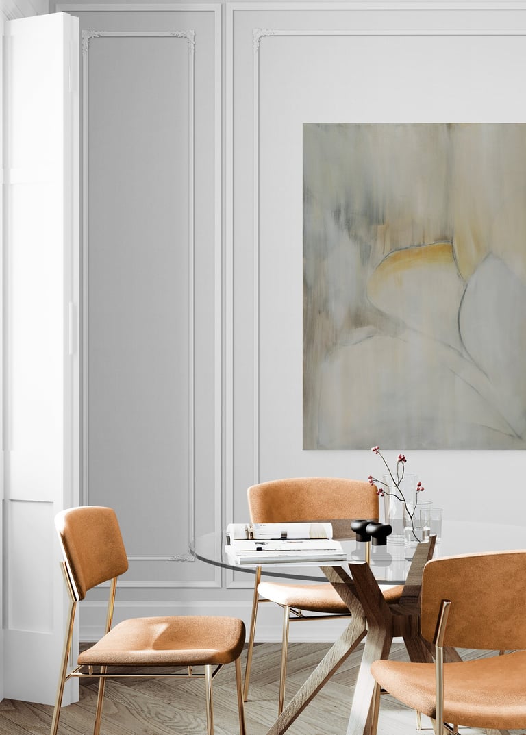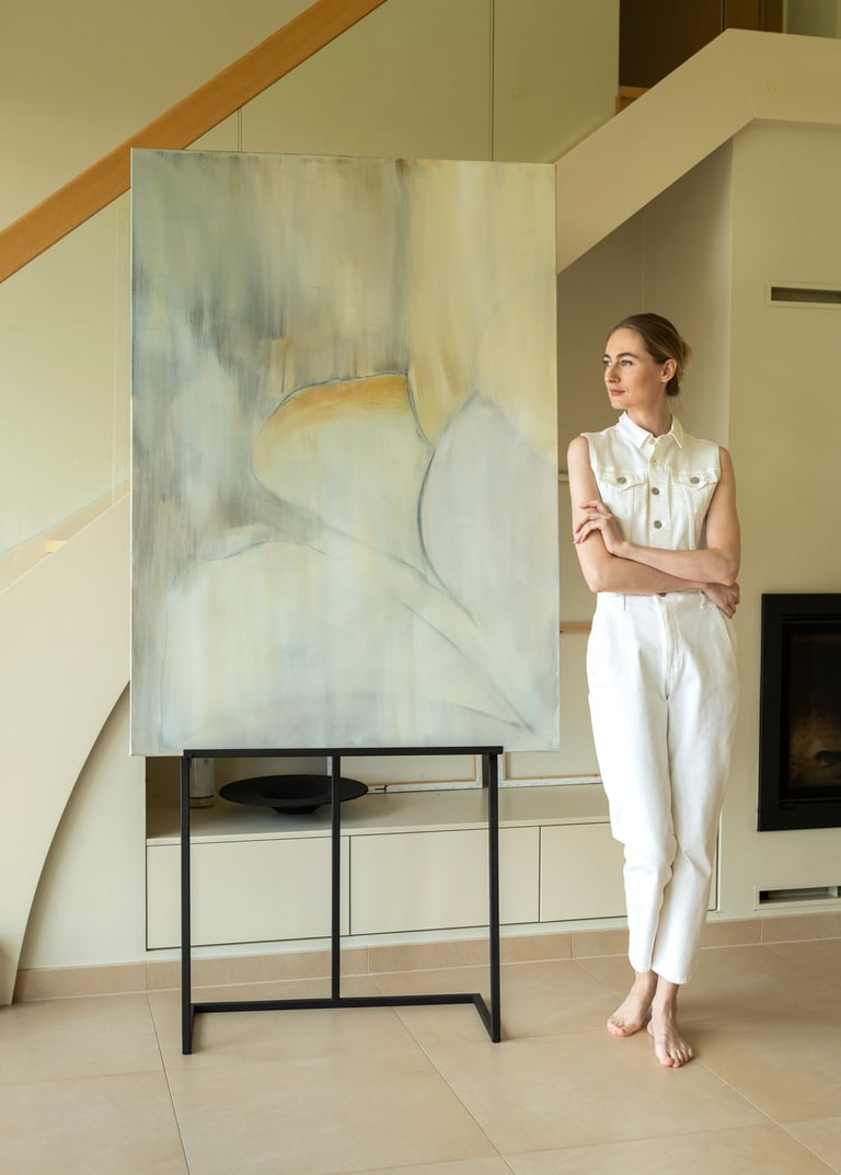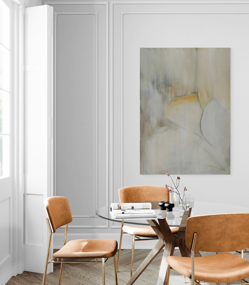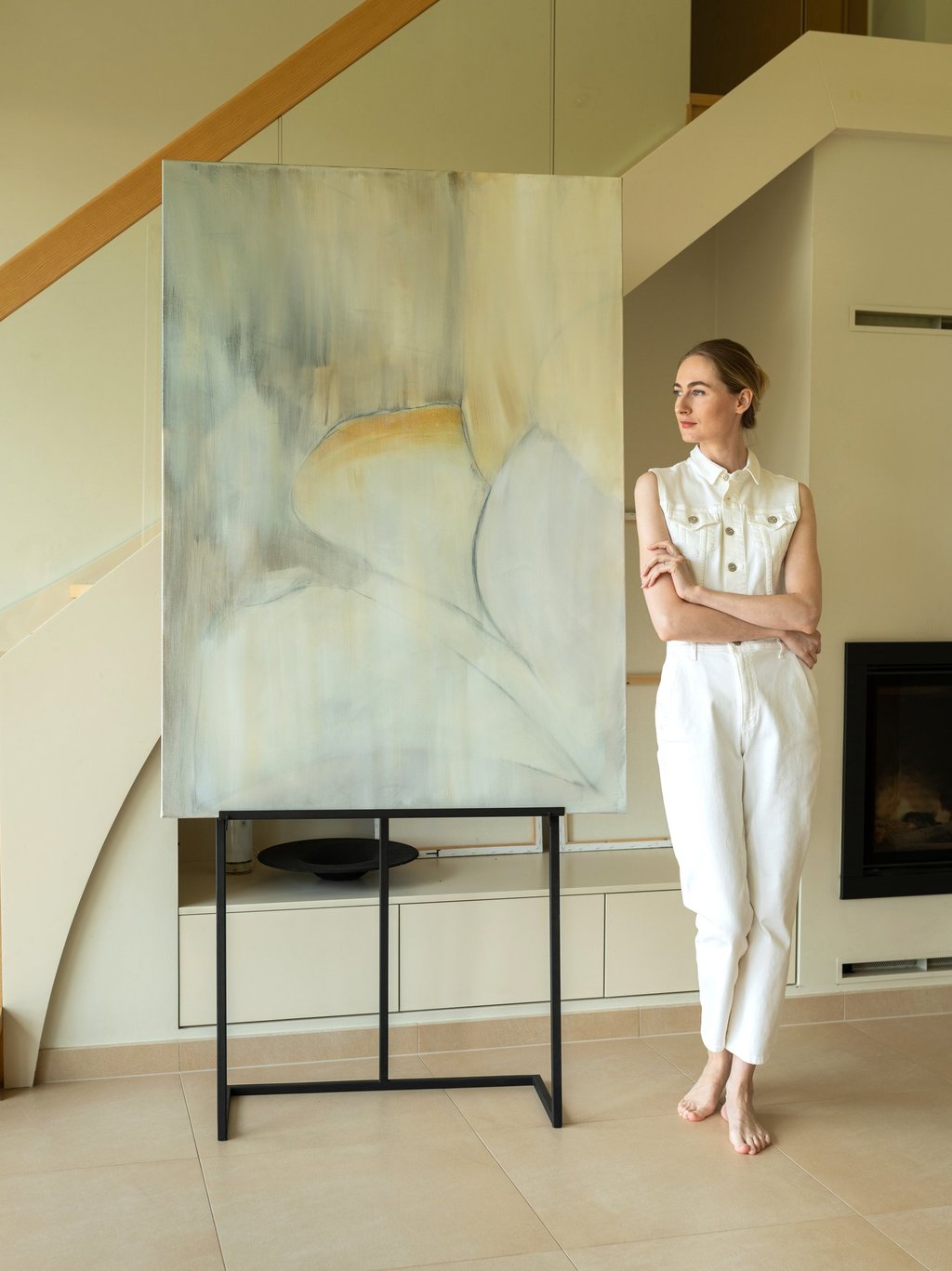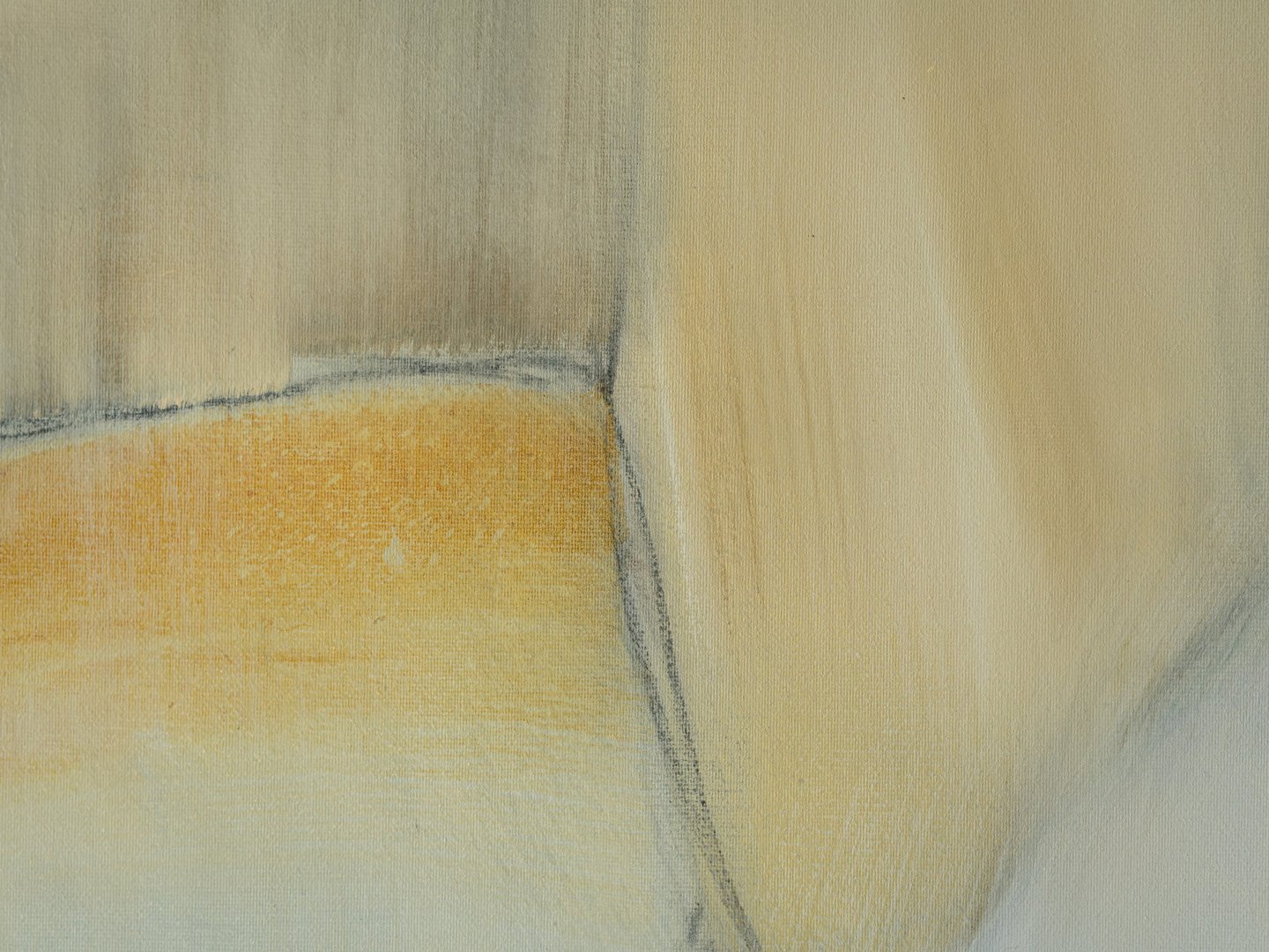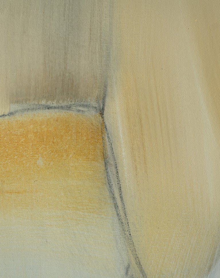 No.126 abstract painting is a gentle-toned composition where pale cream, soft grey, and light yellow brushstrokes blend into a translucent, quiet whole. Vertical layers and delicate lines create visual depth—like a calm mist that allows space to breathe and thoughts to settle.