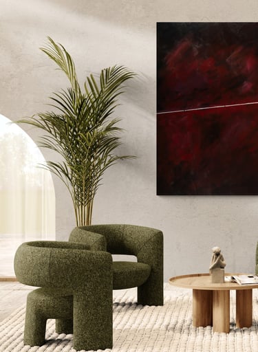 This symbolize the journey of life and the different phases and moments that we experience along the way. The deep red hues convey a sense of passion, intensity, and emotion, while the singular white line represents a path or direction within this complex journey. This painting serves as a reminder to embrace the various phases and moments of life, and to find beauty and meaning in each step of the journey.